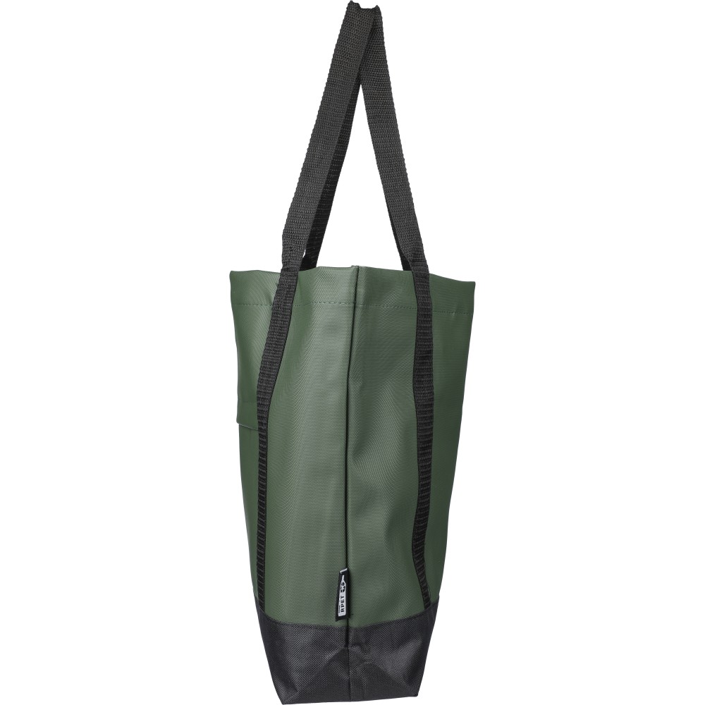 600D rPET poliészter bevásárlótáska. Mindkét oldalon PU bevonat teszi vízlepergetővé. Első cipzáras zsebbel, kicsi, belső cipzáras zsebbel és hosszú hordozófüllel. Kapacitása 10 liter. Oldalán rPET címkével.