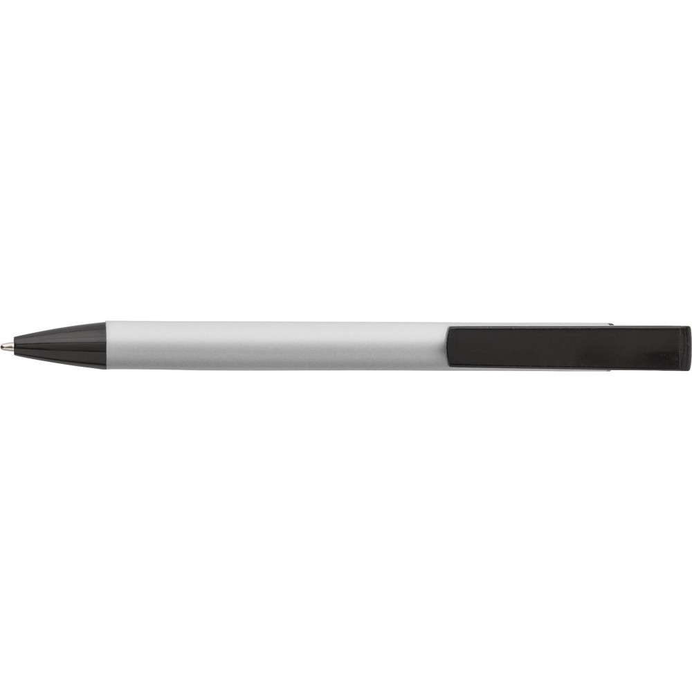 Golyóstoll nyomógombos mechanikával, mobiltartóval, fekete kiegészítőkkel, kék tollbetéttel. Alumínium.