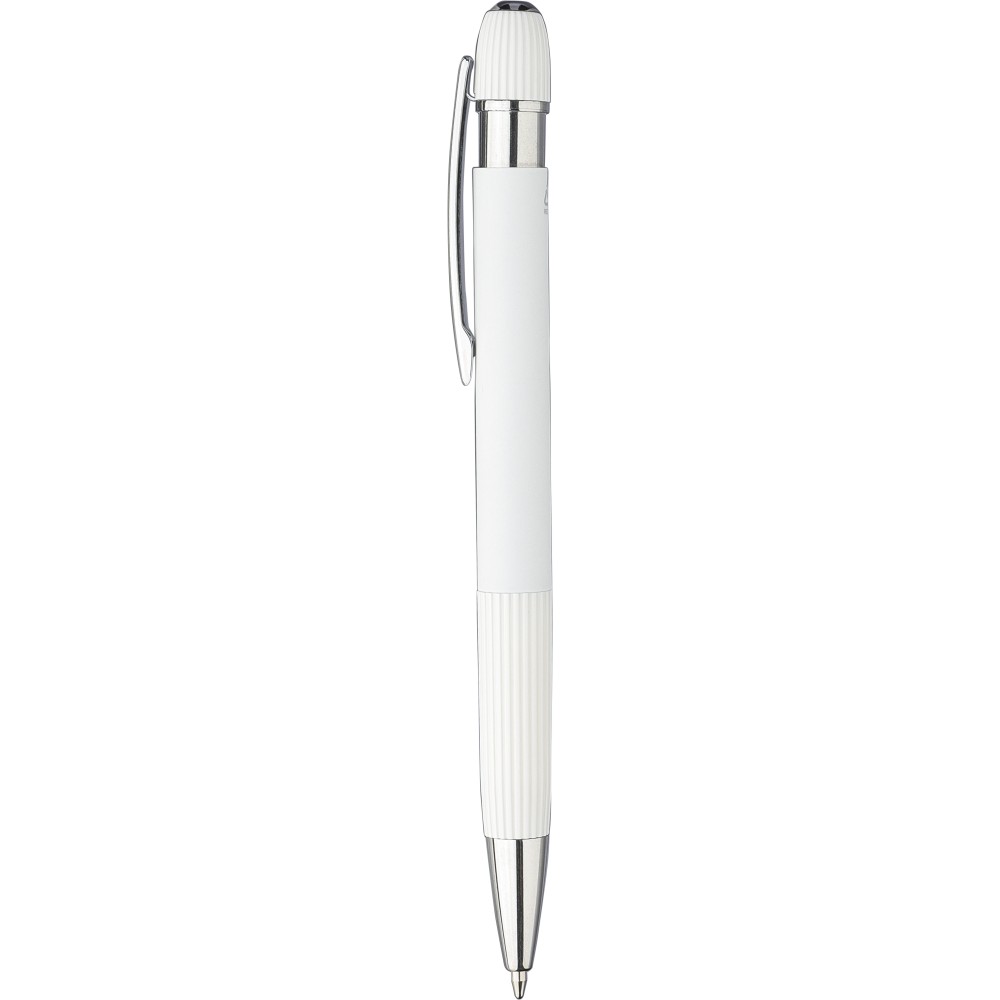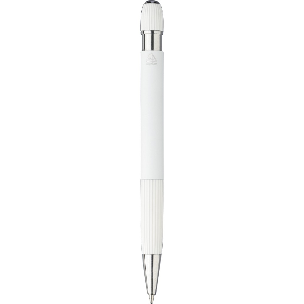 Újrahasznosított alumínium golyóstoll gumírozott felülettel. Bordázott részletekkel a markolaton és a tetején, krómozott műanyag heggyel és fém klipsszel ellátott nyomógombbal. Lézergravírozott újrahasznosított logóval. Kék tintával.