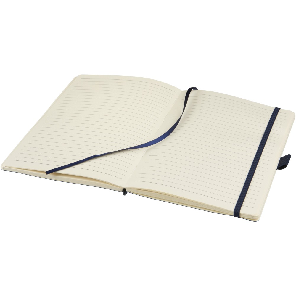 Puha borítású (A/5) jegyzetfüzet, gumis záródással, jelölővel, tolltartó hurokkal, hátoldalán zsebbel jegyzetek tárolására. 80 db krém színű vonalas (80gsm) lappal. Fekete papírhüvelybe csomagolva.