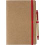 Újrahasznosított karton jegyzetfüzet 60 sima lappal. Tartalmazza a hozzáillő karton/szalma tollat kék tollbetéttel. Gumis összefogó pánt és tollhurok.