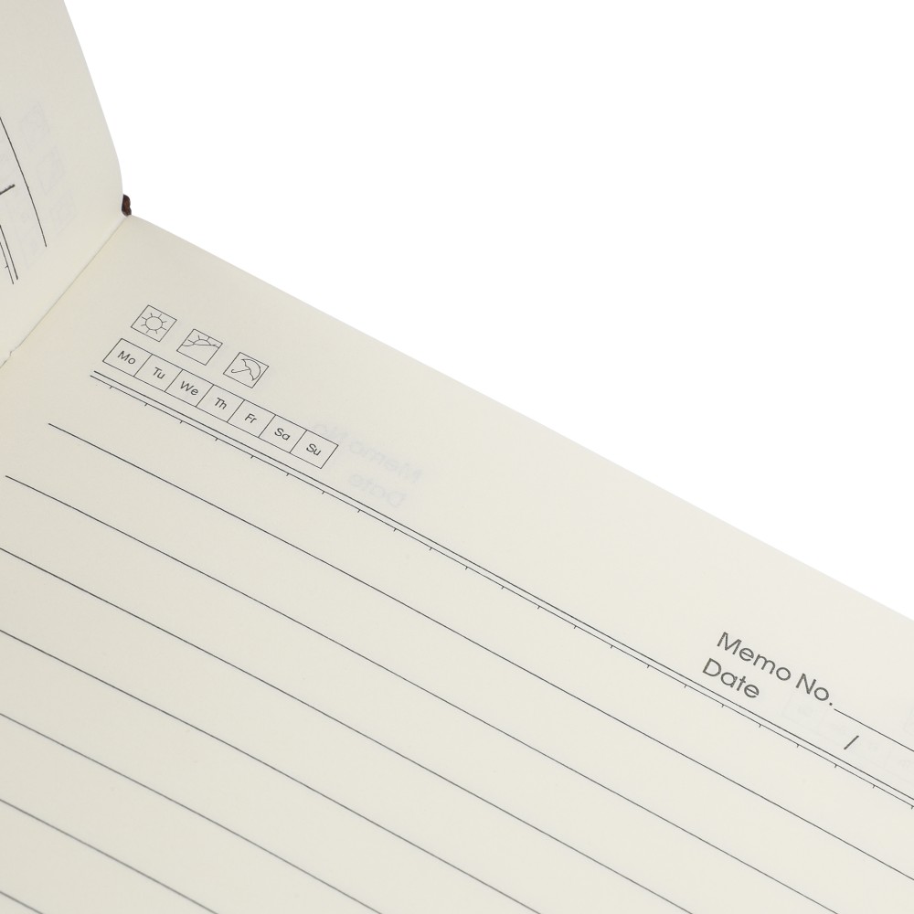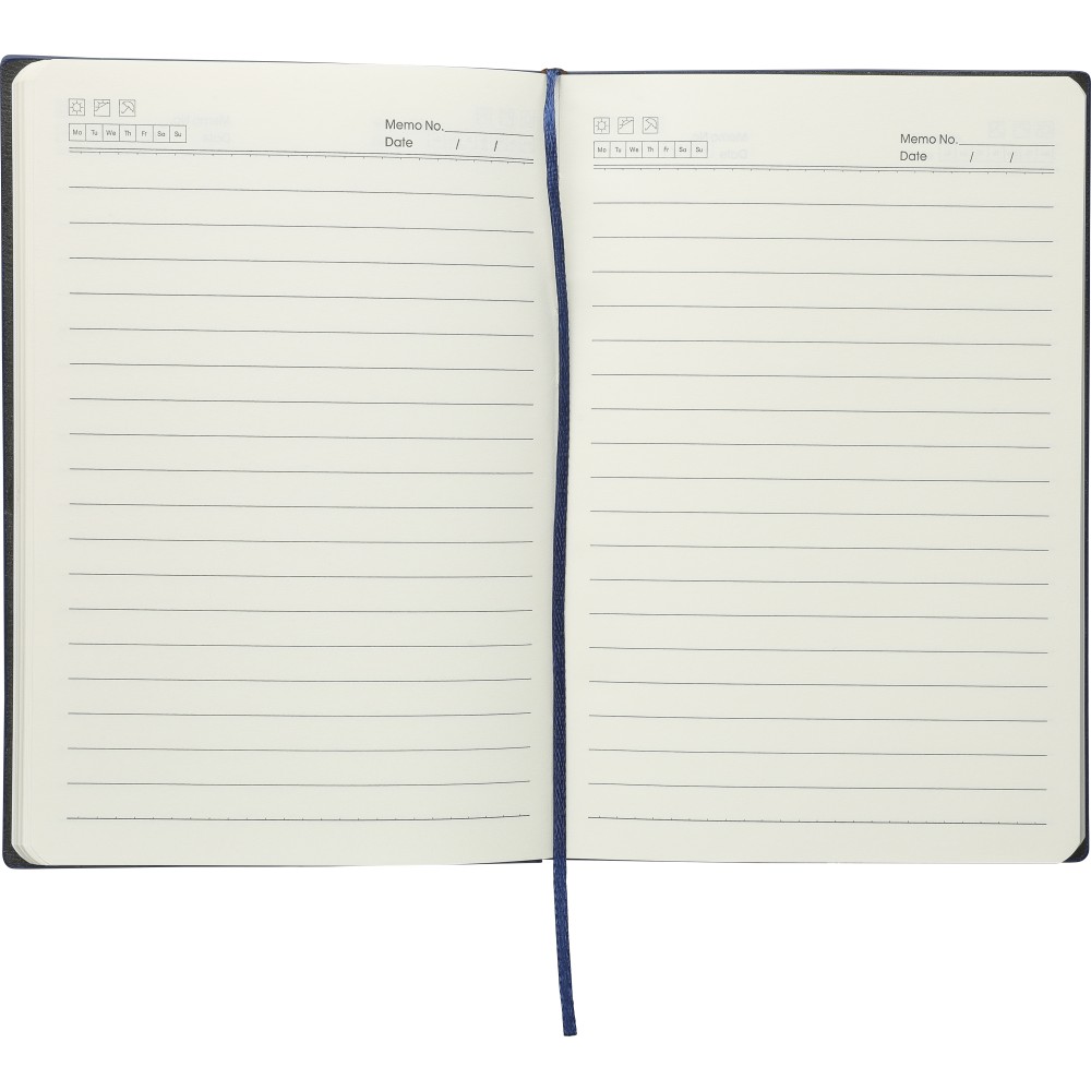 Újrahasznosított PU jegyzetfüzet, kb. A5-ös méretű, 100 lapos. Kemény borítóval és kordbársony hatású bevonattal az elülső és a hátlap felső részén. Tartalmaz egy szalagos könyvjelzőt és 80 g/m2-es vonalas lapokat. A hátoldalon dombornyomott újrahasznosított logóval.