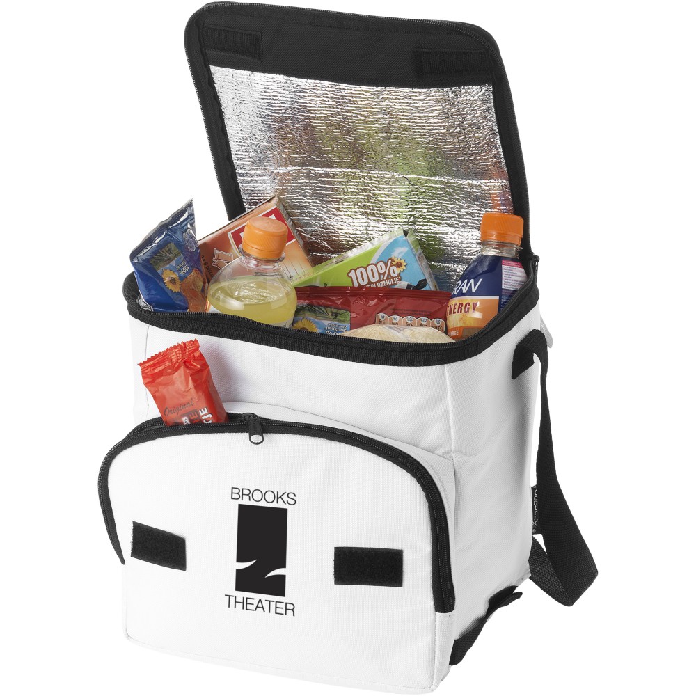 Összehajtható hűtőtáska cipzáras fő rekesszel és cipzáras elülső zsebbel. Állítható vállpánt. A hűtőtáska laposra hajtható az elülső zseben található horog és hurok segítségével. Egyéb kiegészítőt nem tartalmaz.