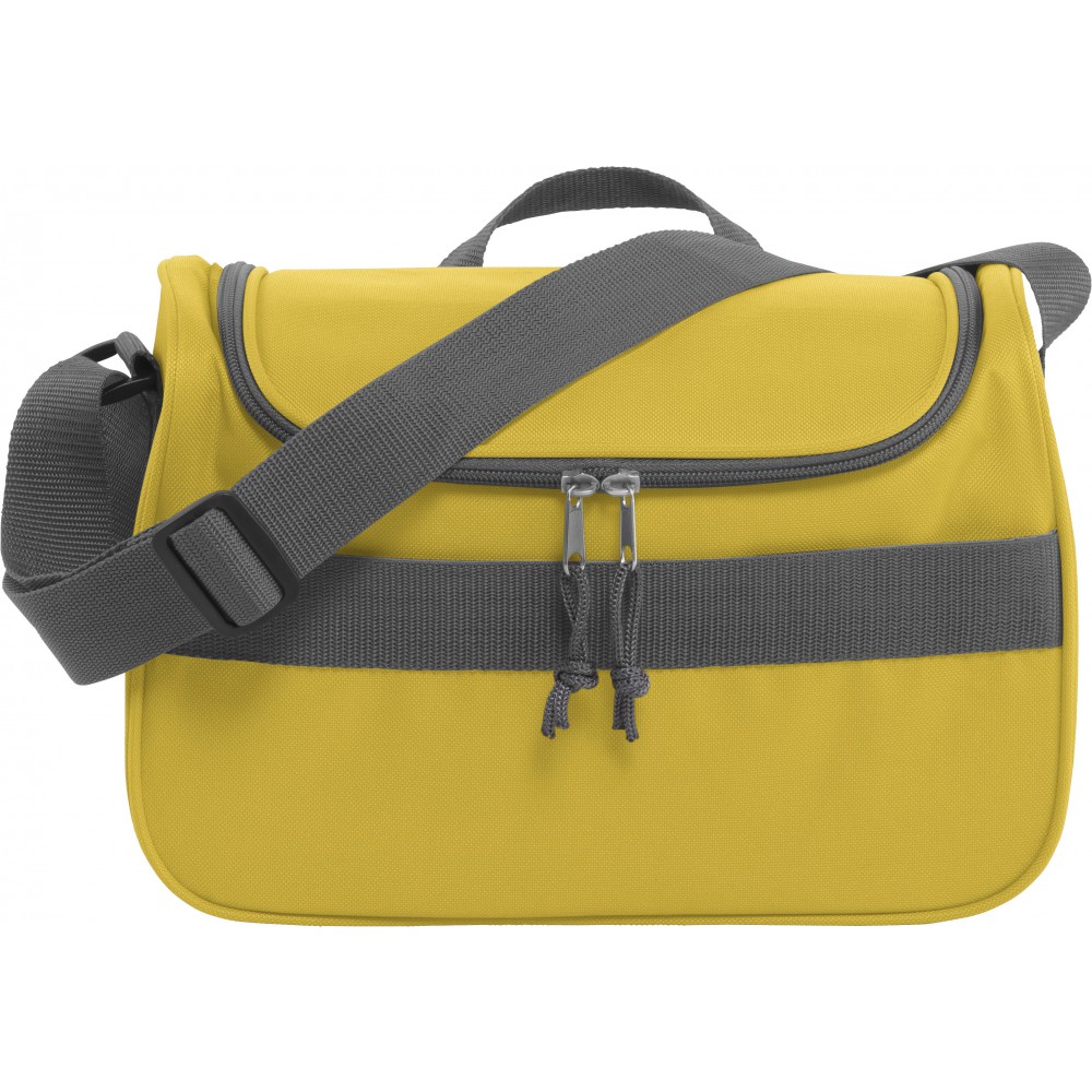 600D poliészter hűtőtáska tépőzáras első zsebbel, egy nagy rekesszel, hordozófüllel és állítható vállpánttal.