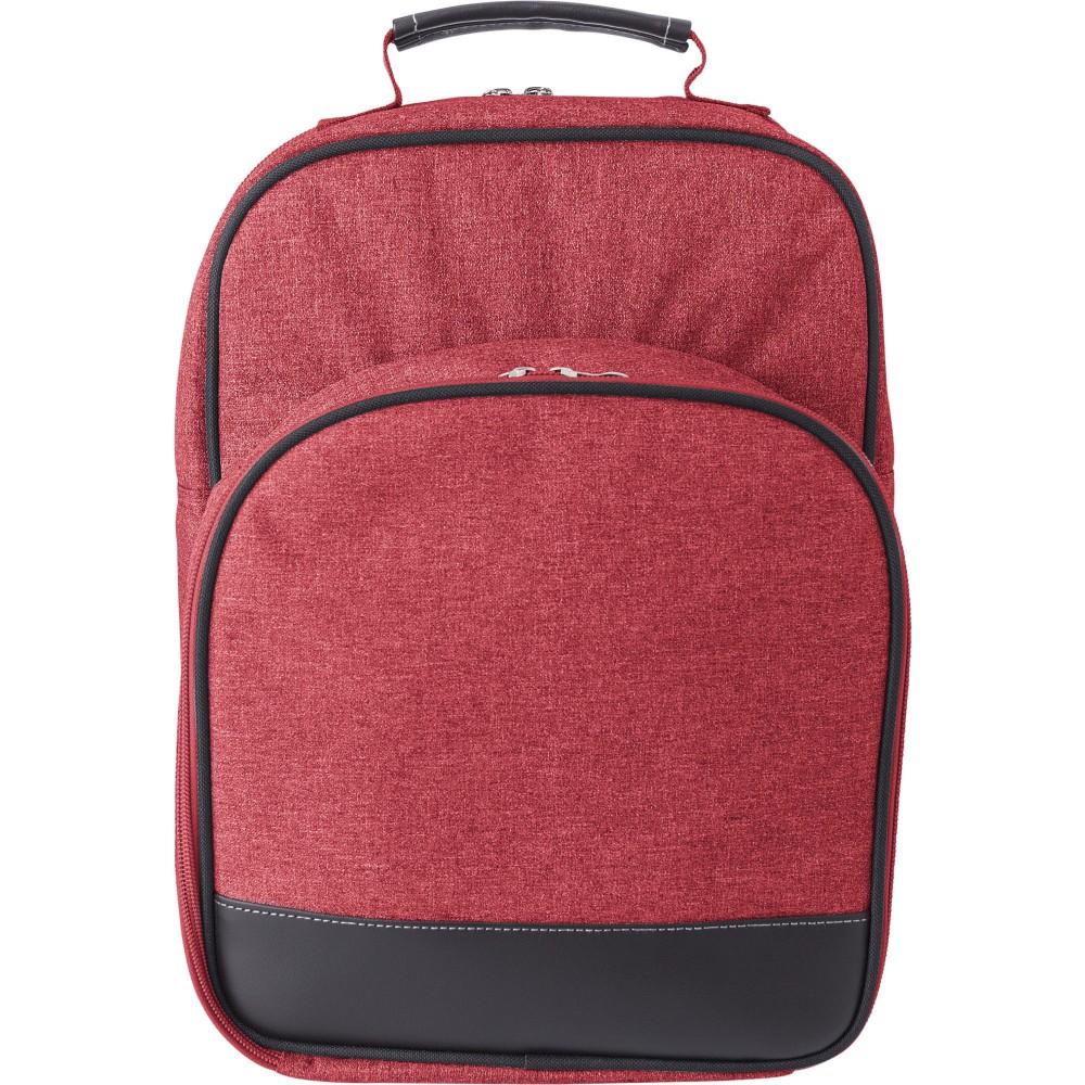 Piknik hűtőhátizsák alumínium fólia béléssel. Egy nagy főrész, egy cipzáros elsőzseb evőeszközökkel és tányérokkal, állítható vállpánt. 600D művászon.