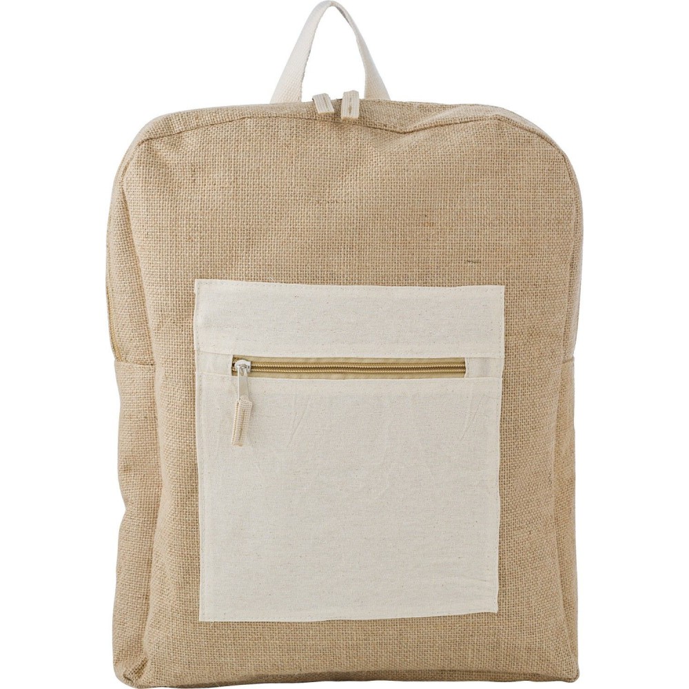 Hátizsák egy cipzáras fő rekesszel, első zsebbel, állítható vállpántokkal. Juta anyag pamut kiegészítőkkel.