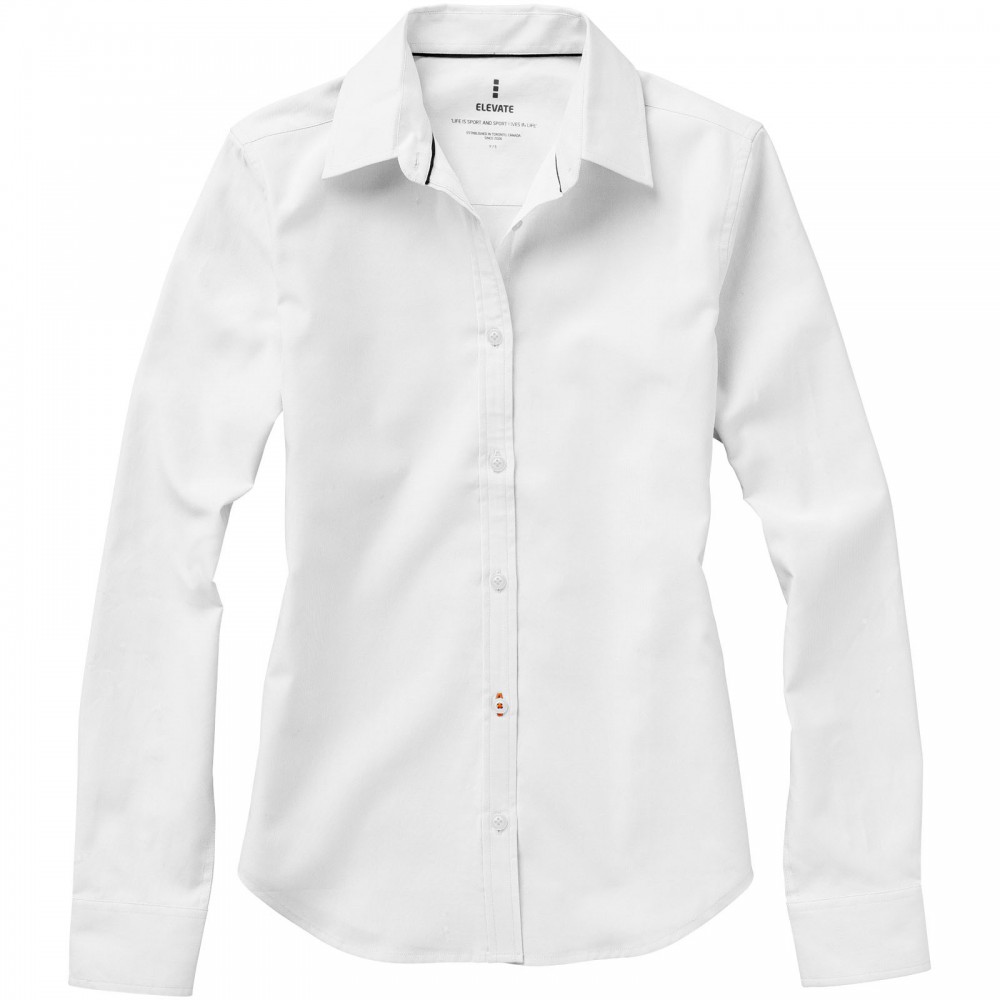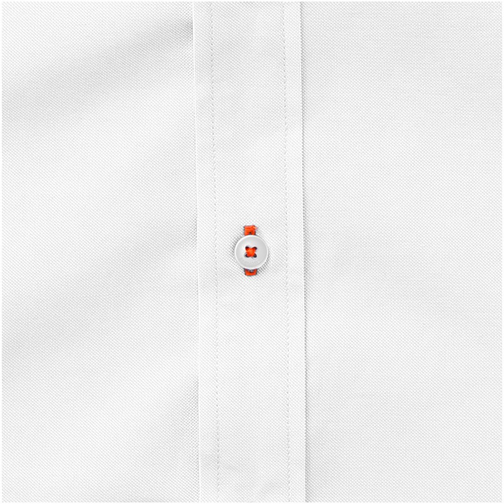 Normál szabásvonal. Elevate logóval gravírozott, fehér gombok. Alulról a második gomblyuk narancssárga öltésekkel dekorálva. Két gombos, állítható kézelő gombolás. Tónusos logónyomat hátul. Szatén szegély a nyakvonalban. Legombolható gallér (férfi). 100% pamut Oxford anyag. 142 g/m2.