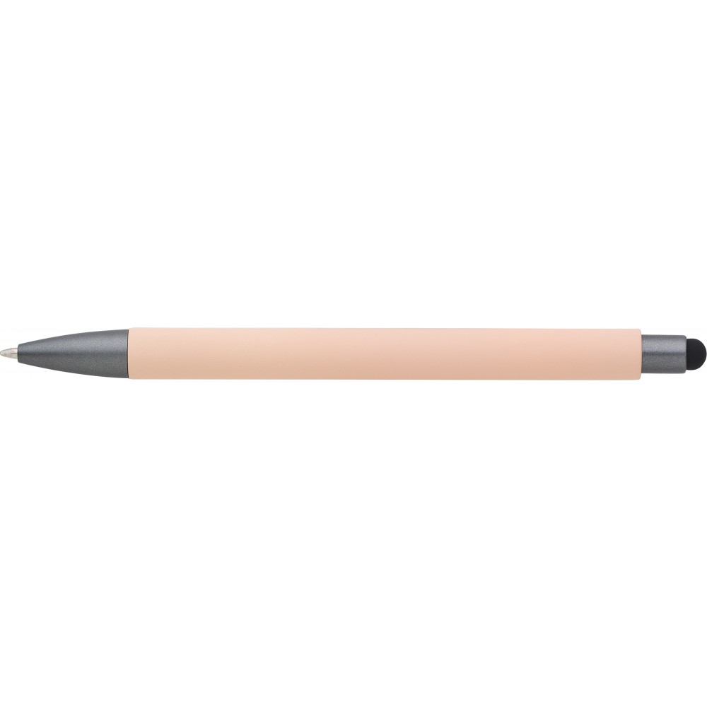 Golyóstoll gumis bevonattal, érintővel, kék tollbetéttel. ABS, PP műanyag, szilikon, vas.