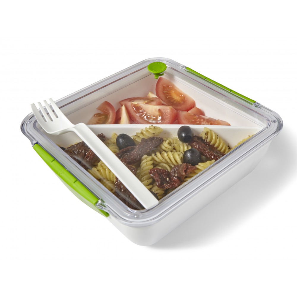 Ételdoboz, mely kenyér tárolására is kiválóan alkalmas. Átlátszó fedéllel, szilikon csatokkal, kivehető, háromszög alakú belső tárolóval, villával. 920 ml. BPA-mentes műanyag.