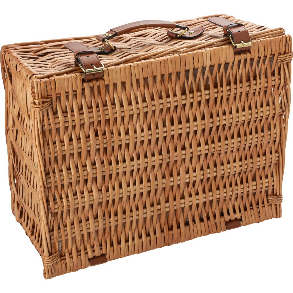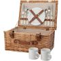Piknikkosár két fő részére. Rozsdamentes acél evőszközök műanyag nyéllel, 2 darab kerámia tányér és 2 darab 0,21 literes kerámia bögre. A termék természetes anyagokból készült, ezért méreteiben eltérések adódhatnak.
