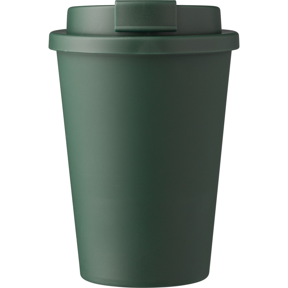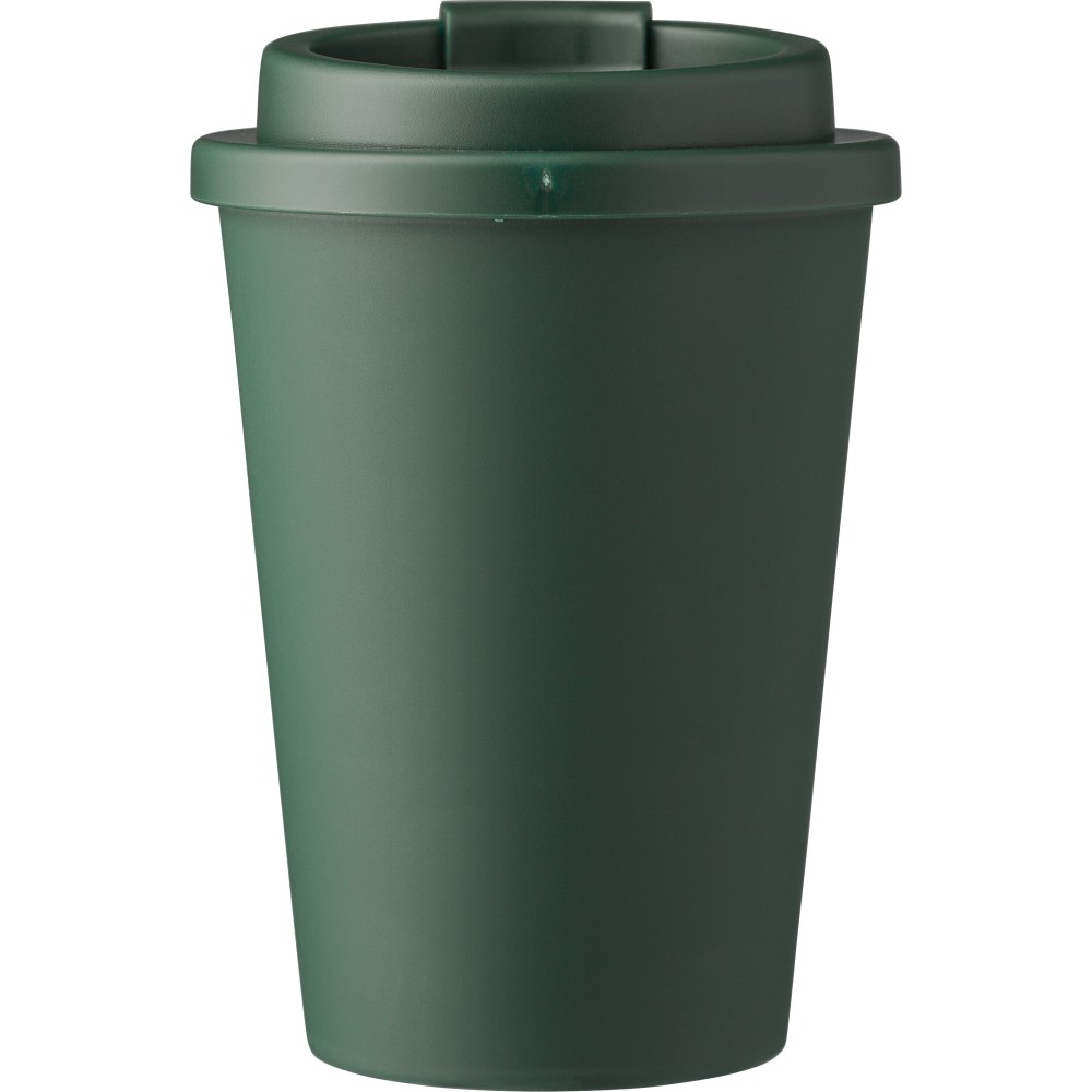Kávéspohár csavaros fedéllel és felpattintható ivórésszel. Jó hőtartó, hideg és meleg italokhoz is használható. Űrtartalom: 350 ml. PP műanyag.