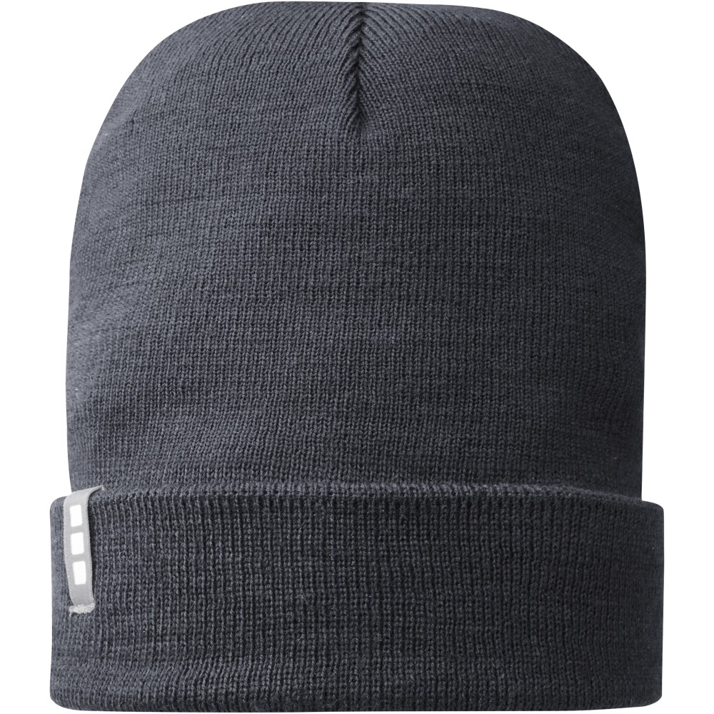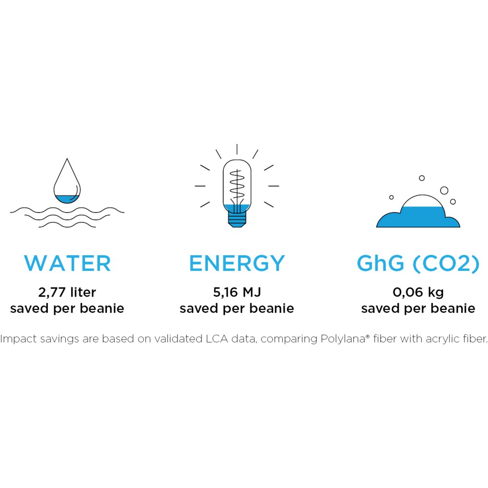 Egyrétegű sapka visszahajtókával, bevarrt márkajelzéssel. A Polylana szál öko alternatívát képez a 100% akril és a gyapjú alapanyagokhoz képest, mert csökkentett víz- és energia-felhasználással készül így csökkentve a CO2-kibocsátást.