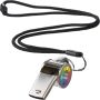 Síp poliészter zsinórral és műanyag biztonsági csattal. Egyenként barna kartondobozba csomagolva. Anyaga: fém.