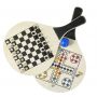 Strandjáték készlet: labdajáték, társasjáték, sakk, fekete nylonzsákban.