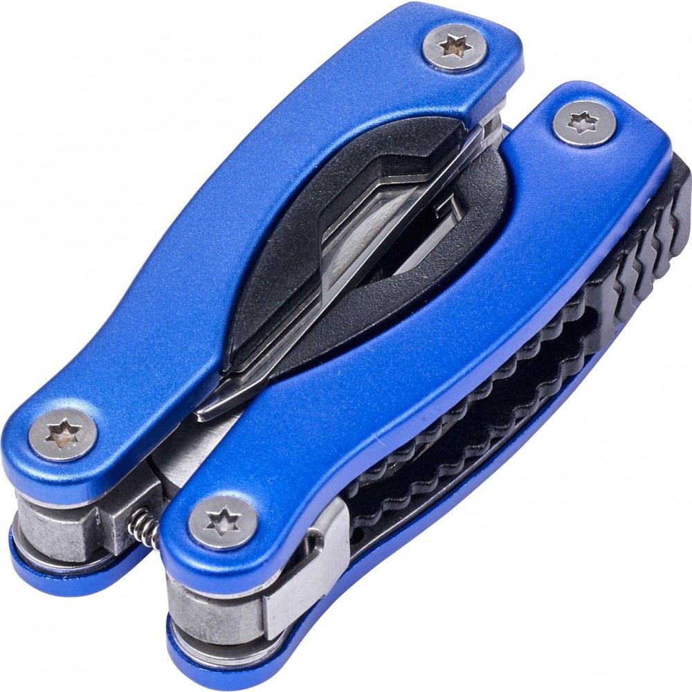 Kompakt multifunkciós szerszám. Funkciók: csavarhúzók (laposfejű és Phillips), reszelő, fűrész, kés, diótörő, doboznyitó és üvegnyitó. Alumínium, rozsdamentes acél