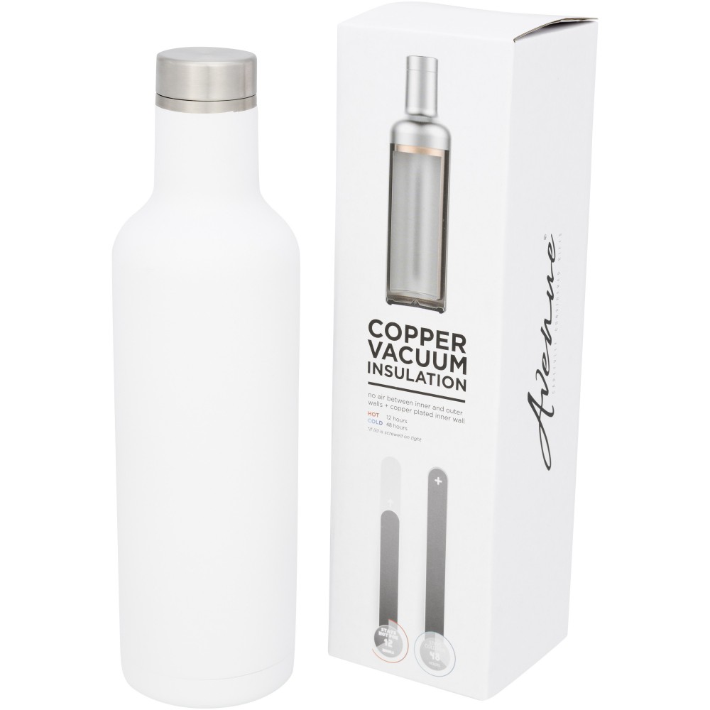 Rozsdamentes, rézbetétes szigetelésű, duplafalú vákumos pohár csavaros fedéllel. Kialakításának köszönhetően a páralecsapódás nem alakul ki. Hőtartóképesség 12 óra, hidegtartó képesség 48 óra. Nem szivárgásmentes. Szénsavas italokkal is használható. Mosogatógépben nem mosható és mikrohullámú sütőben történő melegítésre nem alkalmas. Űrtartalom: 750 ml. Csomagolása Avenue ajándékdoboz. Rozsdamentes acél.