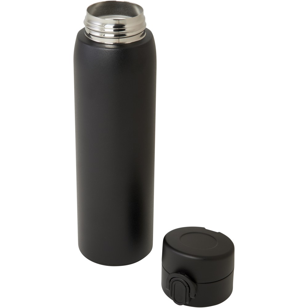 Stílusos, RCS tanúsítvánnyal rendelkező újrahasznosított rozsdamentes acélból készült, szigetelt palack gombos nyitómechanizmussal. A flaska szivárgásmentes és a réz vákuumszigetelésnek köszönhetően az italokat több órán keresztül forrón vagy hidegen tartja. Űrtartalom: 450 ml. Újrahasznosított kartonból készült díszdobozban szállítjuk.