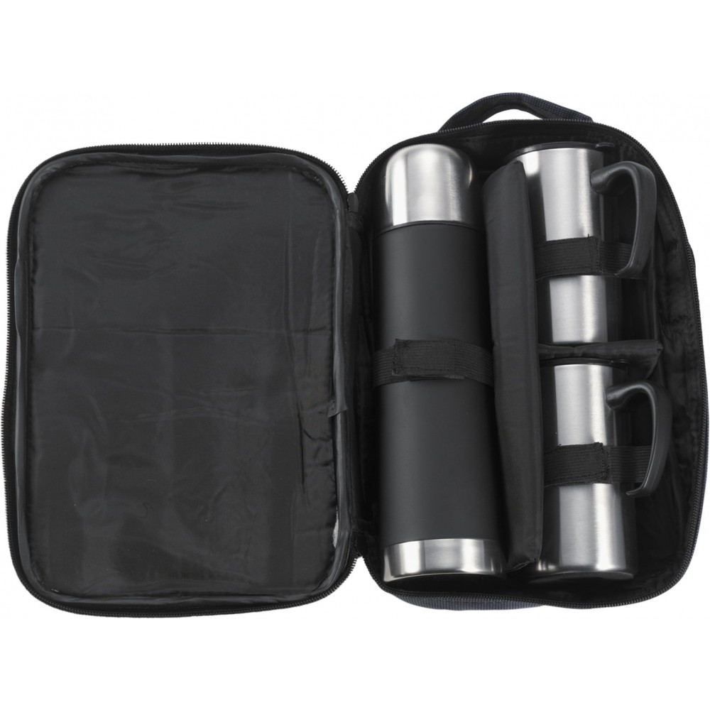 500 ml-es termosz 2 db duplafalú, 260 ml-es bögrével. Rozsdamentes acél, nylon tokban. Nem szivárgásmentes. Mosogatógépben nem tisztítható.