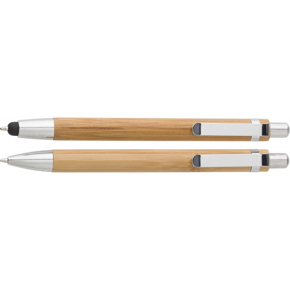 Bambusz tollkészlet kartondobozban. Nyomógombos toll kék tollbetéttel, érintővel és töltőceruza HB keménységű heggyel.