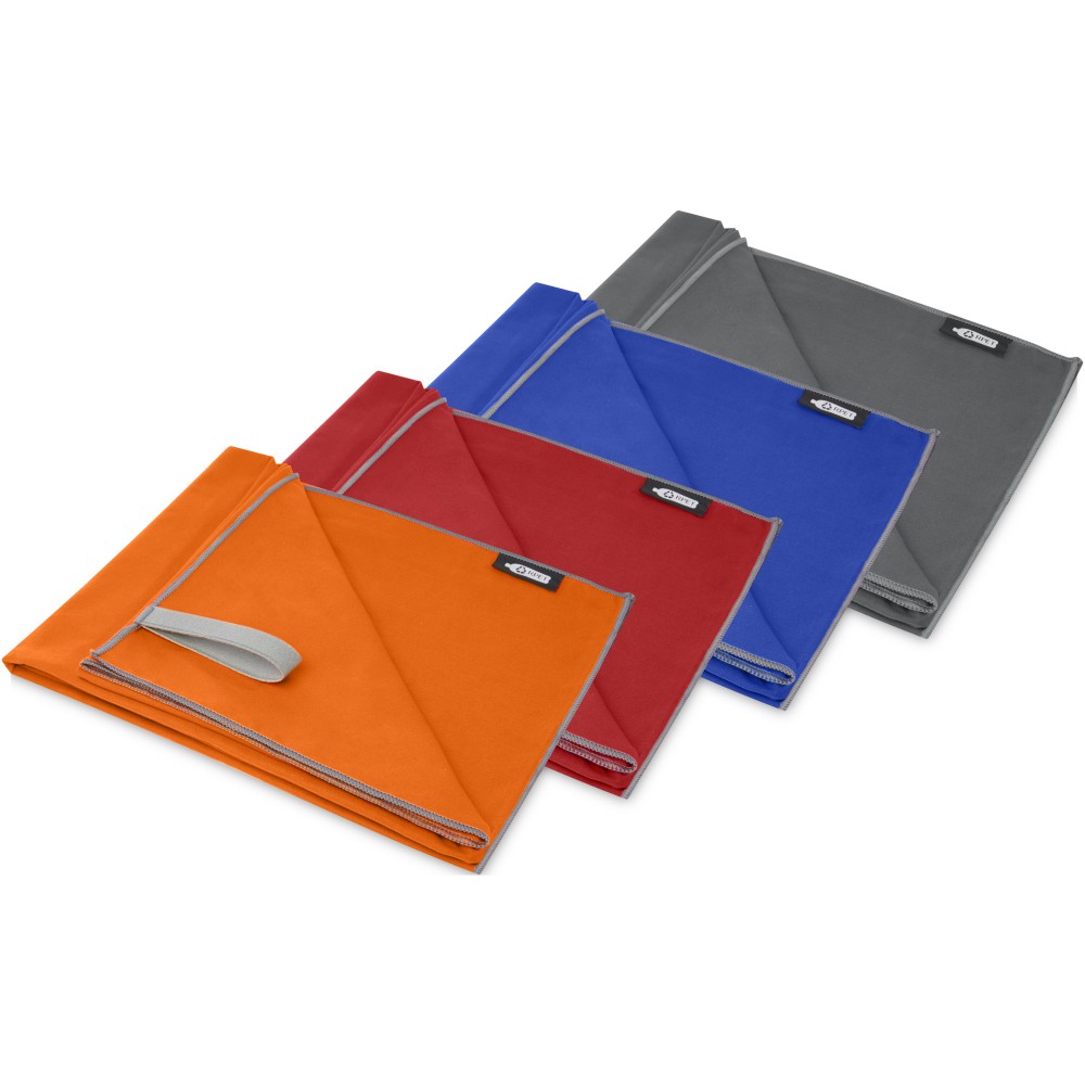 Ez a sporttörölköző nagyon jó nedvszívó, könnyű és gyorsan szárad. Ha a törölközőt összehajtjuk és gumiszalaggal rögzítjük, kis mérete miatt alkalmas edzőterembe, uszodába, vagy kempingezésre. A törölköző 130 x 80 cm méretű, 200 gr/m2-es újrahasznosított PET poliamidból készült, mosógépben 40°C-on mosható. Újrahasznosított PET műanyagból készült tároló tasakkal (20 x 8,5 cm) szállítjuk, amely remek helyet biztosít a logó nyomtatásához.