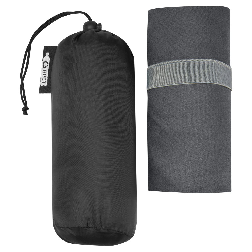 Ez a sporttörölköző nagyon jó nedvszívó, könnyű és gyorsan szárad. Ha a törölközőt összehajtjuk és gumiszalaggal rögzítjük, kis mérete miatt alkalmas edzőterembe, uszodába, vagy kempingezésre. A törölköző 130 x 80 cm méretű, 200 gr/m2-es újrahasznosított PET poliamidból készült, mosógépben 40°C-on mosható. Újrahasznosított PET műanyagból készült tároló tasakkal (20 x 8,5 cm) szállítjuk, amely remek helyet biztosít a logó nyomtatásához.