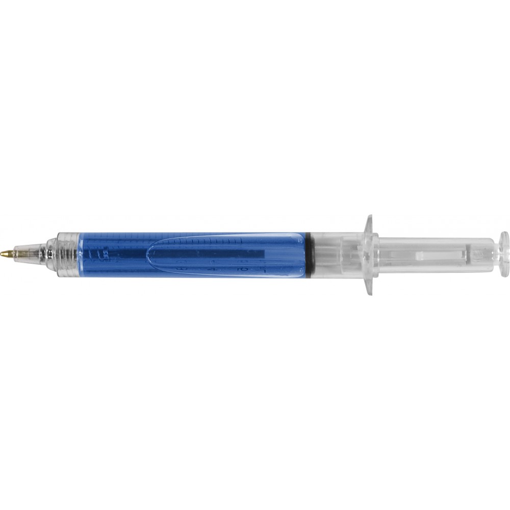 Injekció formájú golyóstoll színes folyadékkal töltve, fekete tollbetéttel.