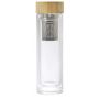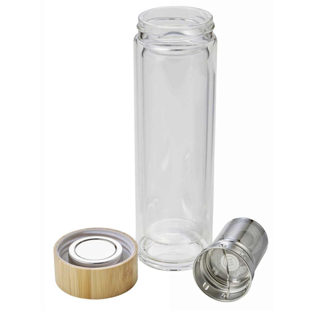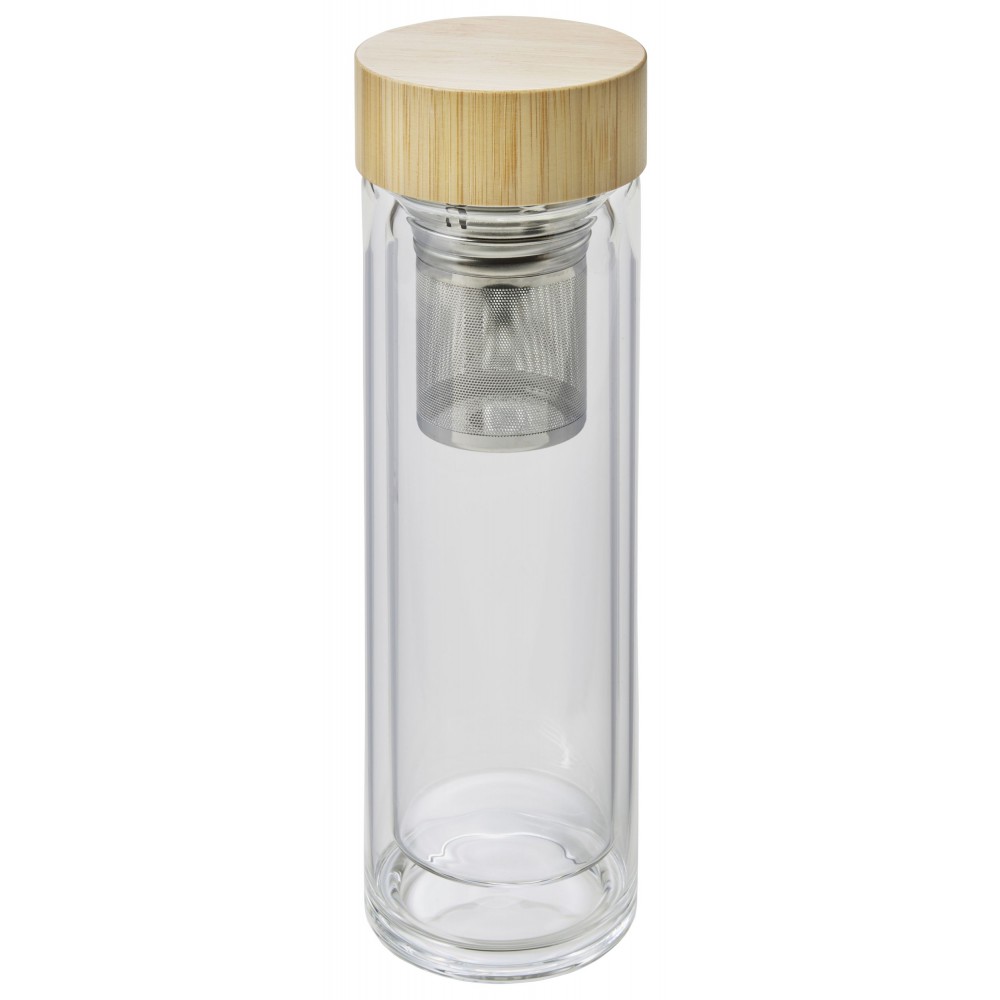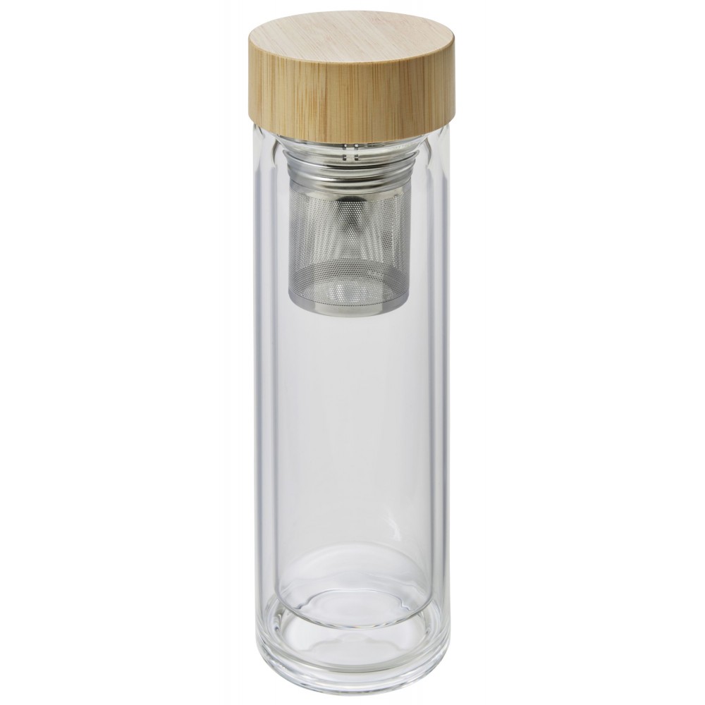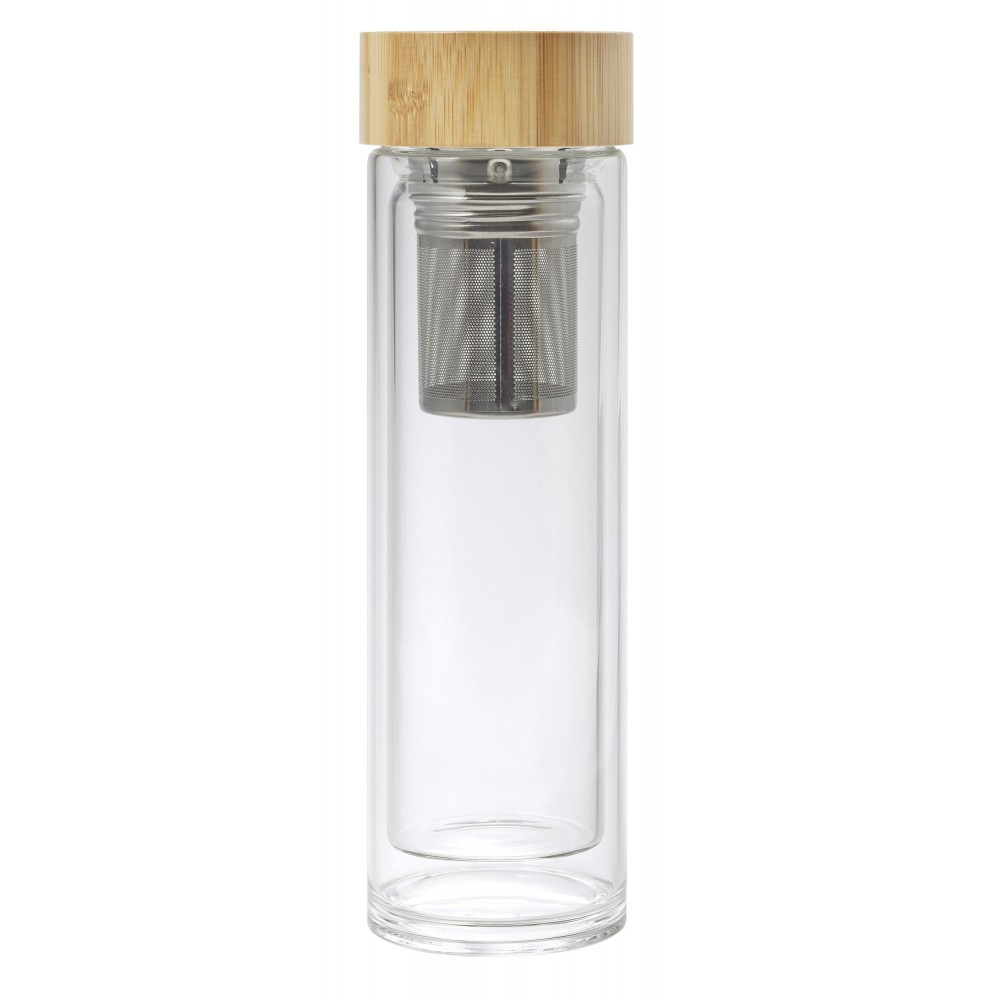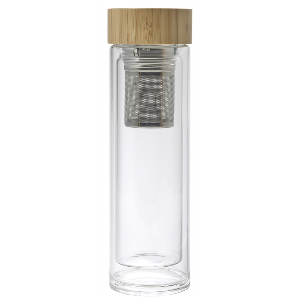 Duplafalú üveg bambusz kupakkal és fém teaszűrővel. Űrtartalom: 420 ml.